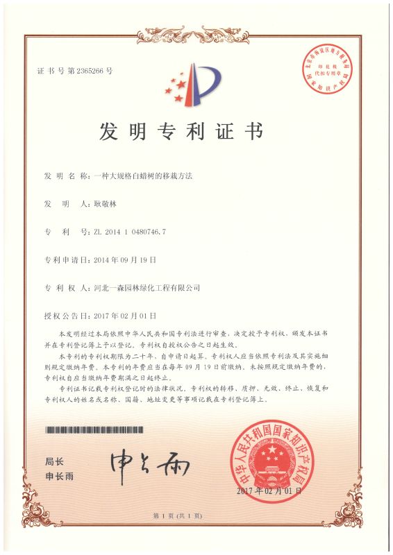 2017年2月1日,國家知識產權局頒發河北一森園林綠化工程股份有限公司“一種大規格白蠟樹的移栽方法”發明專利證書,專利號ZL201410480746.7,證書號2365266。本發明專利涉及樹木的移栽技術領域,移栽成活率高,投資少,簡單易行,效果好,效益高。在園林綠化工程中作用突出,好掌控,效果顯著。河北一森園林已建成全國知名的大規格白蠟基地,在本發明專利方法的指導下,大規格白蠟的移栽成活率高達95%。